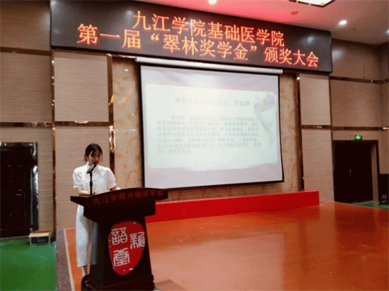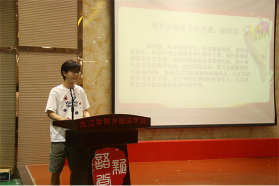 获奖员工代表医学A2116班徐伟宣和A2252班罗岚烨同学依次上台发言。他们分享了自己的学习经验和心路历程,表达了对学校和余翠林女士的感激之情,并鼓励同学们珍惜在校时光,努力学习专业知识,勇敢地面对未来的机遇和挑战。