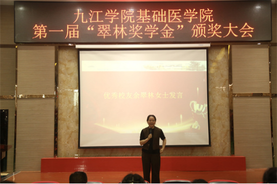 表彰大会上,优秀员工余翠林女士上台发言。她表示,作为九院学子,设立“翠林奖学金”的初衷是希望在学弟学妹们之中播撒一颗“种子精神”,把自己的微薄之力传承下去。她从自己的求学和工作经历娓娓道来,勉励同学们珍惜时光、努力学习、积极参与志愿服务,学会感恩,将个人的成长与社会的进步紧密相连。