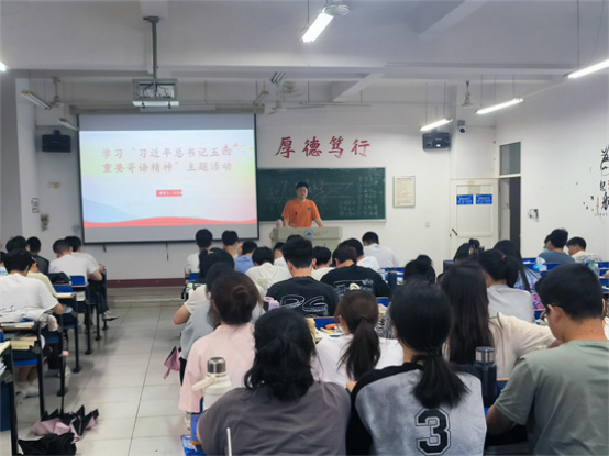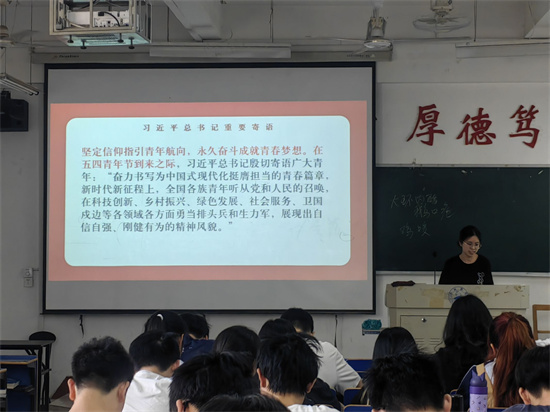 在义丰楼405教室,A2218班以习近平总书记寄语“共青团要肩负起新时代新征程党赋予的使命任务,传承弘扬优良传统,团结凝聚广大青年为党和人民事业不懈奋斗”为切入口,同学们积极分享出自己的学习心得感悟