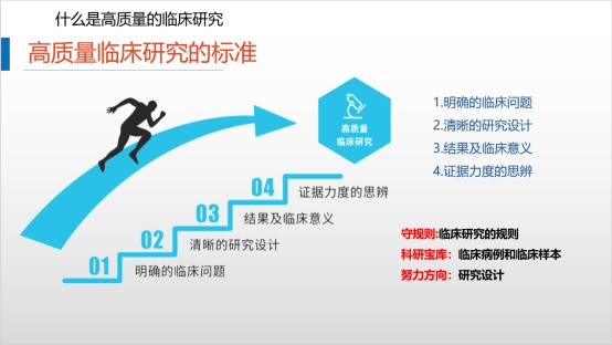 会议提到什么是高质量的临床研究?黄博士表示研究应具备明确的临床问题、具有科学清晰的研究设计、研究结果应具有高价值的临床意义、同时针对研究结论具有充分的证据力度的思辨。