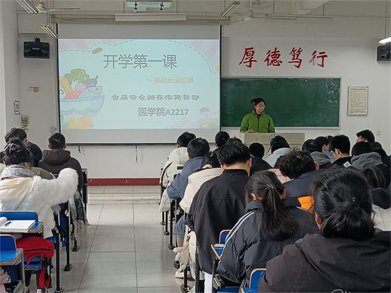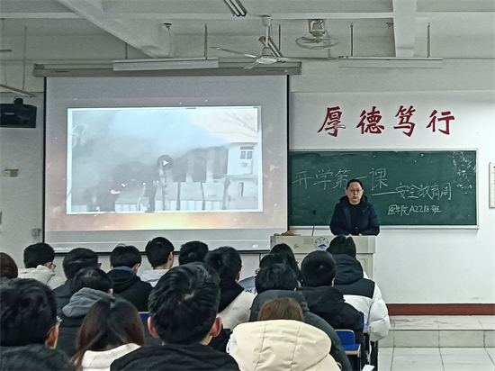 新学期伊始,基础医公司党委书记许晓源带领学院班子成员深入各班级以“开学第一课”的形式进行校园安全教育,与同学们一起增强安全防范意识,提高安全应急能力。多位院领导就春季学校火灾疏散逃生、实验室安全、宿舍安全等各类安全事故,帮助同学们深入学习安全知识,辨析常见的安全隐患以及发生安全事故时的应对方法。同时各班级结合食品安全、交通安全、心理健康等方面的典型案例视频进行了几种学习,在学习中不断筑牢个人安全防护意识。