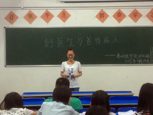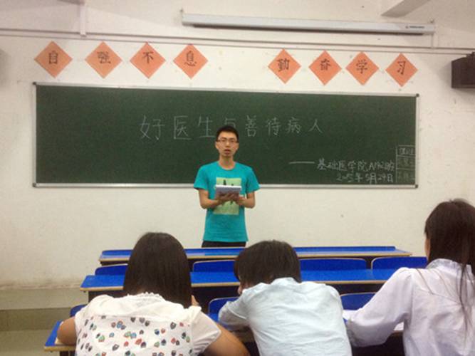 班长曹锐说:何为一个好医生,即精湛的医术和对病患的善待。在疾病面前,生命无贵贱之分,更没有身份的区别,只有无条件的爱,才是真正的善待。医学的本质是人学,它是一种善良人性和友爱情感的表达。作为医生,我们应该注重自己的人文修养,人文修养虽然无形,却隐藏在医生的一颦一笑,举手投足之间,没有它医生就成了修理匠,手术刀就成了屠宰刀。随后,同学们发表自己的看法。对于善待病人,要换位思考,多站在病人的家属角度上看问题,应该将更多地爱心、同情心、关心注入到病人身上,让他们感受到温暖,做到有效沟通,才能真正消除医患纠纷。