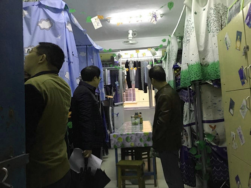 领导老师们了解了寝室文化节活动情况,认真查看了寝室卫生及美化环境,检查过程中,余书记看到一男寝室贴有“悬壶灌顶”四个大字的背景墙后,提出了建设“文明寝室”的必要性,希望同学们能够建立起“以寝为家”的意识,友爱互助,重视安全卫生,树立优良寝风,注重学习成绩提高和个人健康成长,密切配合学校学院的寝室文化建设。