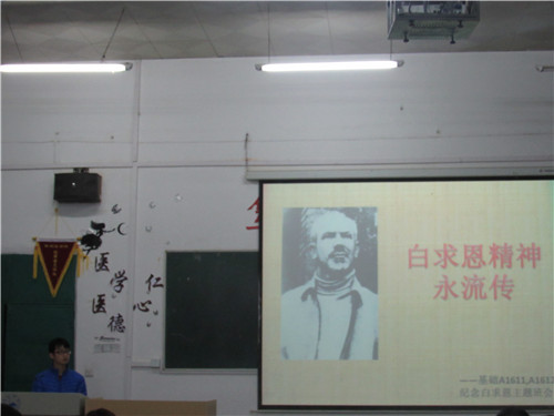最后,余朝阳对同学们的主题班会的形式和效果给予了肯定,对白求恩的生平事迹作了补充强调,他高度赞美了白求恩的人道主义精神,并希望同学们要学习白求恩对待工作的严谨态度和勇于创新的精神。