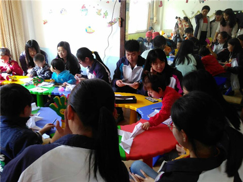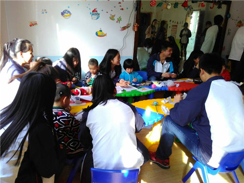 在阳光康复中心,志愿者们与儿童们相互交流,相互沟通,他们陪孩子们做游戏,教孩子们读书,写字等。志愿者们在与孩子们玩耍的过程中,脸上的笑容发自内心,孩子们也是洋溢着开心的笑容。