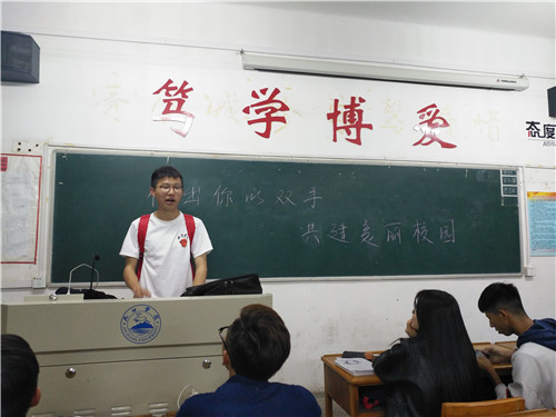 首先各班团支书上台发言,给同学们讲解此次团日活动的意义。接着员工代表发言,谈及自己对本次团日活动的理解与看法。他说到,校园是我们共同的家园,我们应该携手并进,为建设一个更和谐美好的校园作出贡献,让爱充满校园的每个角落。同时,员工代表也提及到建设和谐校园的意义,让同学们更深刻的理解与支持,为建设校园付出自己的一份力。最后团支书号召全班同学走出班级,走出寝室,伸出双手,打扫校园,为积极响应此次主题,为共建美丽校园出一份力。