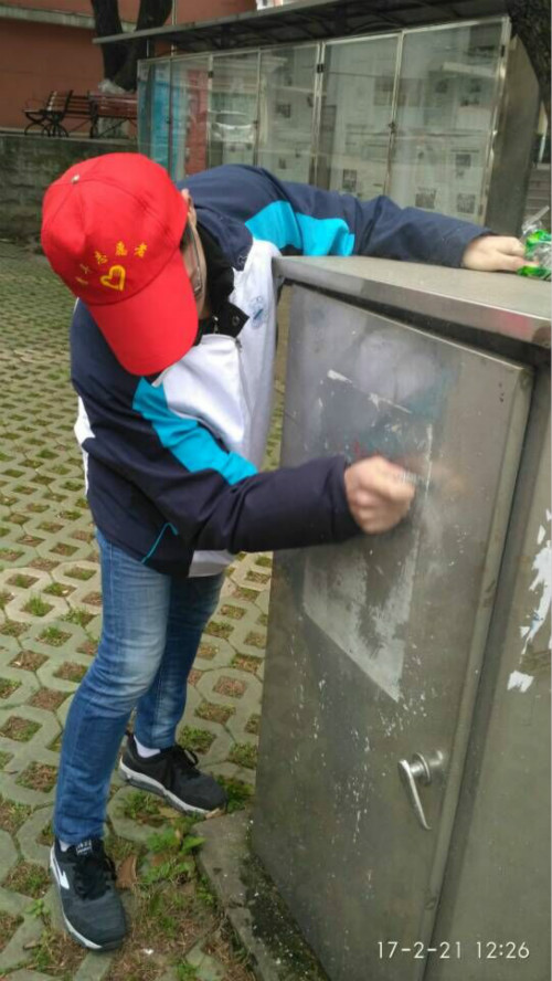 志愿者们认真地搜寻隐藏在校园各个角落里的牛皮癣,包括电线杆、宣传栏、垃圾桶、教室等,一经发现有残留的小广告,马上动手清理!再顽固的牛皮癣也要清除。一切有碍学校的美观的不雅广告都必须清理掉。