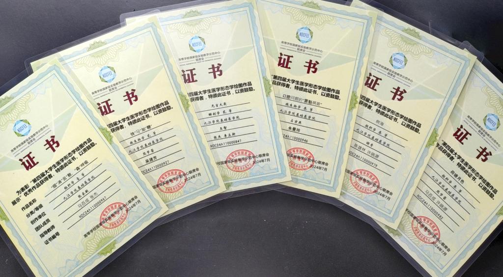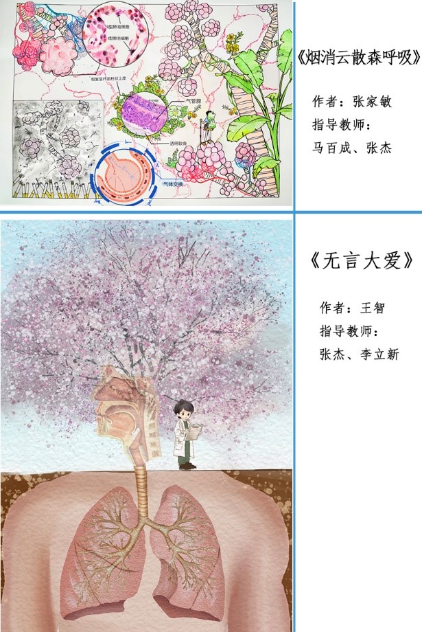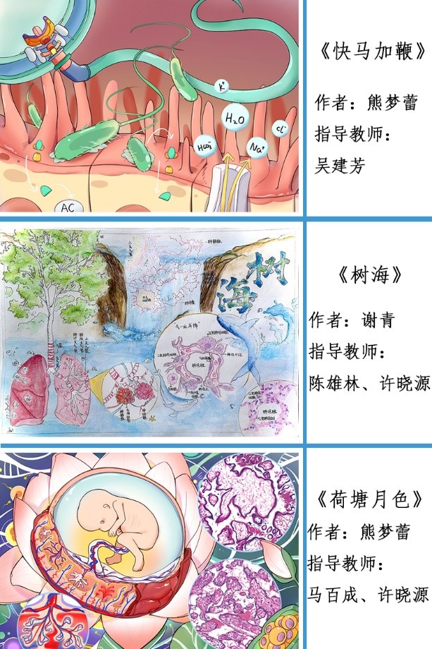公司教师马百成和张杰指导、张家敏同学绘制的作品《‘烟’消‘云’散,‘森’呼吸》获得“组织学组”比赛一等奖,张杰和李立新老师指导、王智同学绘制的作品《无言大爱》获得“解剖学组”比赛二等奖,吴建芳老师指导、熊梦蕾同学绘制的作品《快‘马’加‘鞭’》获得“微生物学组”比赛二等奖,陈雄林和许晓源老师指导、谢青同学绘制的作品《树海》、马百成和许晓源老师指导、熊梦蕾同学绘制的《荷塘月色》获得组织学组比赛三等奖,朱曼玲老师指导、占京燕同学绘制的作品《口腔问题的“罪魁祸首”》获得微生物学组比赛三等奖,吴建芳、余辉老师指导、梁昱同学绘制的作品《消化系统的常见致病菌》获得微生物学组比赛优秀奖。