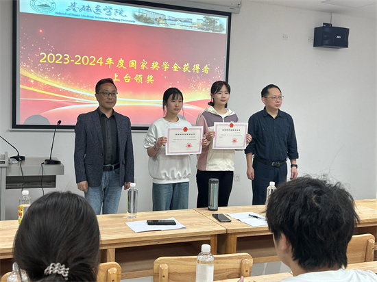 刘频健宣读了获奖名单。申研、罗岚烨2名同学荣获国家奖学金,江哲立、宁杳等29名同学获得国家励志奖学金。刘频健强调,本次评选严格遵循"公平、公正、公开"原则,经个人申请、班级评议、学院审核等环节层层选拔,确保每一份荣誉都经得起检验。他希望获奖同学珍惜荣誉,继续发挥模范作用,带动更多同学追求卓越。