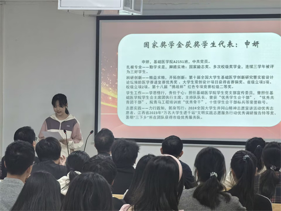 国家奖学金获得者申妍同学作为员工代表发言。她分享了在学业、科研、实践方面的成长经验,感恩了学校给予的荣誉,强调医学学习需要脚踏实地的积累和科学高效的方法。她呼吁同学们珍惜实践机会,在服务社会中践行医者初心,以实际行动诠释"健康所系,性命相托"的铮铮誓言。