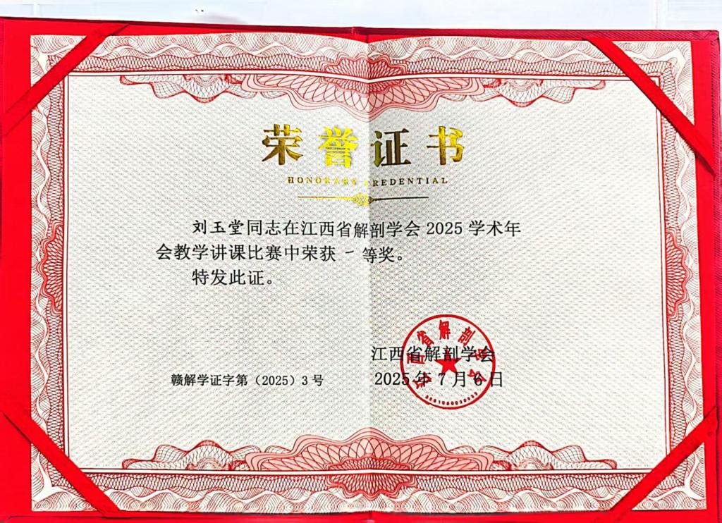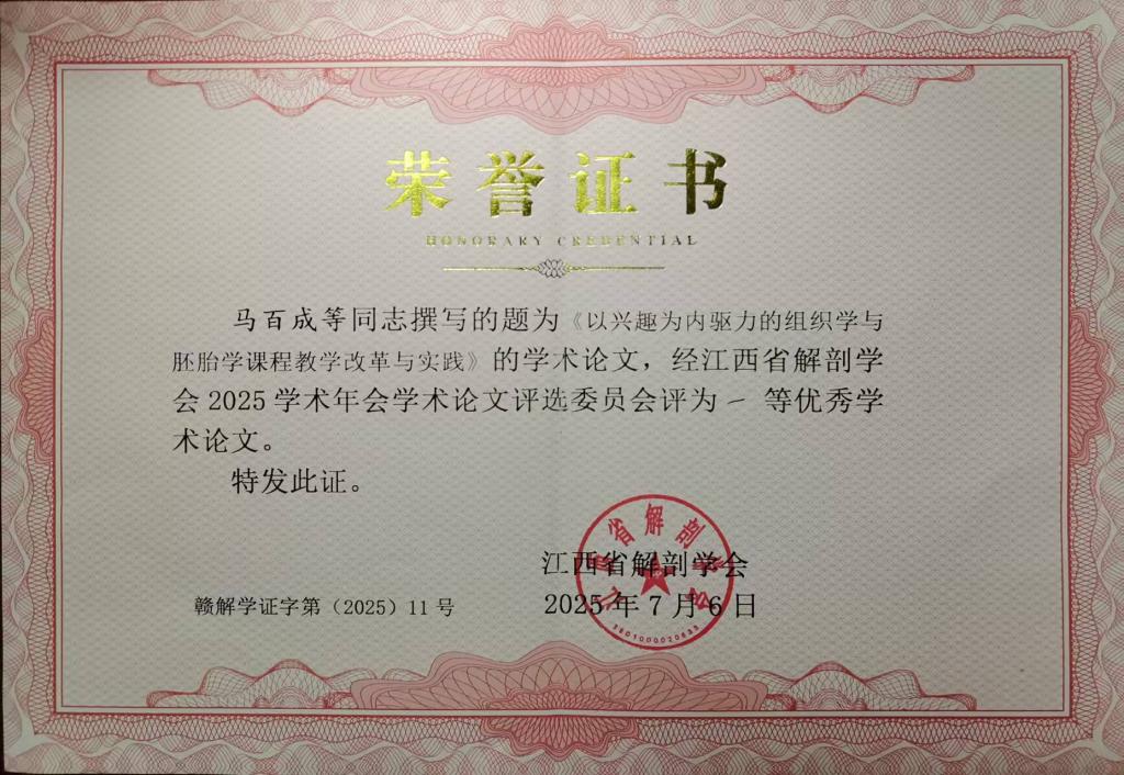 在科研与教学交流环节,公司马百成老师作了题为《以兴趣为内驱力的组织学与胚胎学课程教学改革与实践》的专题报告,分享了在激发员工学习动力、提升教学效果方面的创新探索与实践经验。在教学讲课比赛环节,刘玉堂老师以《视器》为主题进行了精彩授课,其教学设计、内容呈现与课堂互动均展现了扎实的教学功底和良好的教学风貌。经过激烈角逐和专家评审,两位老师均获得了由江西省解剖学会颁发的一等奖荣誉证书,为学院赢得了荣誉。
