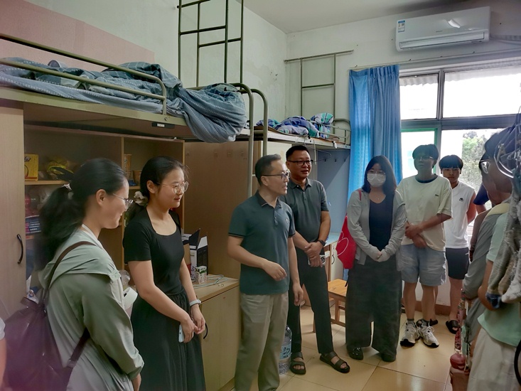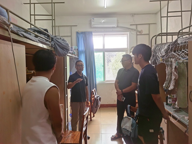 在毕业班的宿舍里,学院领导与留校实习生亲切交流,详细询问大家毕业实习进展与生活情况。张辉强调,实习生务必严格遵守单位规章制度,强化安全意识,特别是在实验操作、医疗防护、上下班交通等环节中“绷紧安全弦”,“确保毕业实习平安、高效”。针对考研员工,张辉还鼓励大家科学规划复习进度,注意劳逸结合,学院将全力提供后勤保障与心理支持。刘频健强调此次走访既是安全督导,更是暖心慰问,为留校毕业班同学发放了防暑降温物资,听取了大家的意见,切实将关怀落到实处。